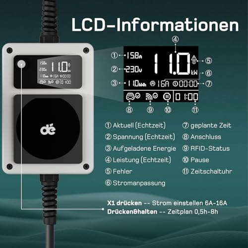 ![dé Mobile Wallbox 11kW [3-phasig|10m|6-16A] mit Ladekabel, CEE auf Typ 2 mit Stromzähler, EV Ladegerät/Ladestation für Zuhause Model Y/3, ID.3/4/5, MG4, EX30, e-up, e-tron, Zoe und andere EVs – Bild 7](https://typ2-ladekabel.de/wp-content/uploads/2024/11/18197-7-de-mobile-wallbox-11kw-3-pha.jpg)